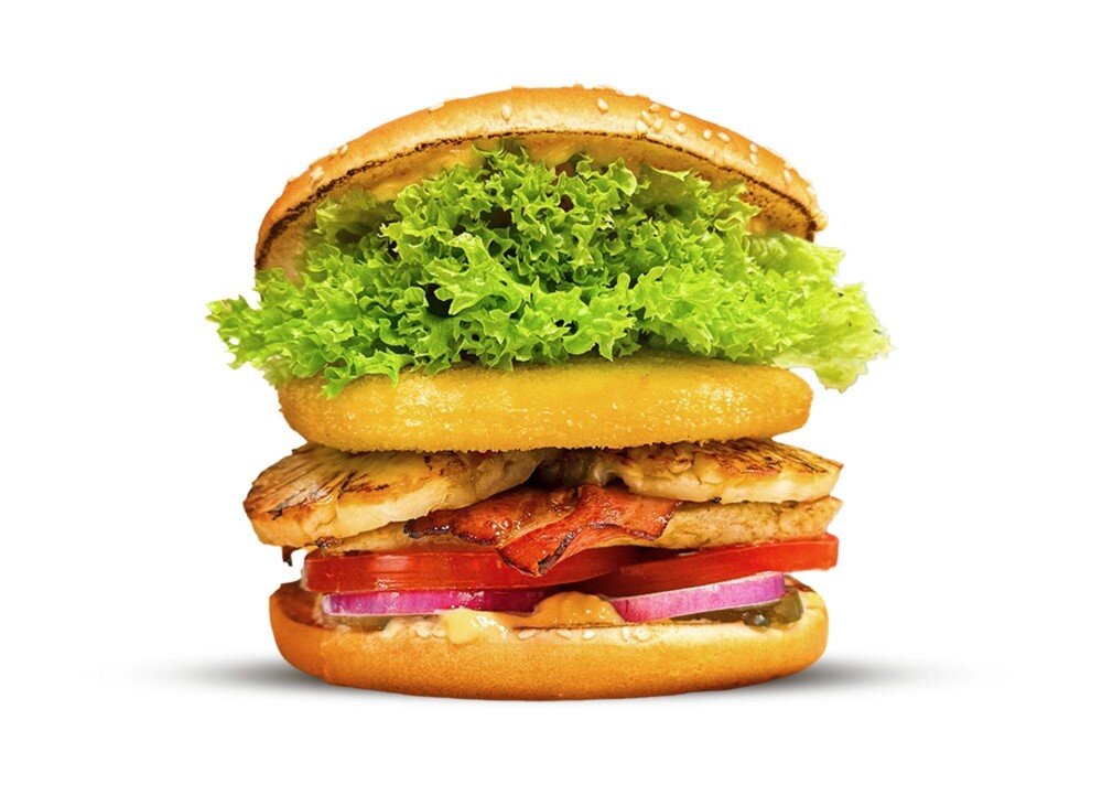 100 g kuřecího steaku, slanina, grilovany ananas, smažený sýr "Gouda", bulka dle výběru, nakládaná okurka, cibule, rajče, salát, medovo-hořčičná omáčka