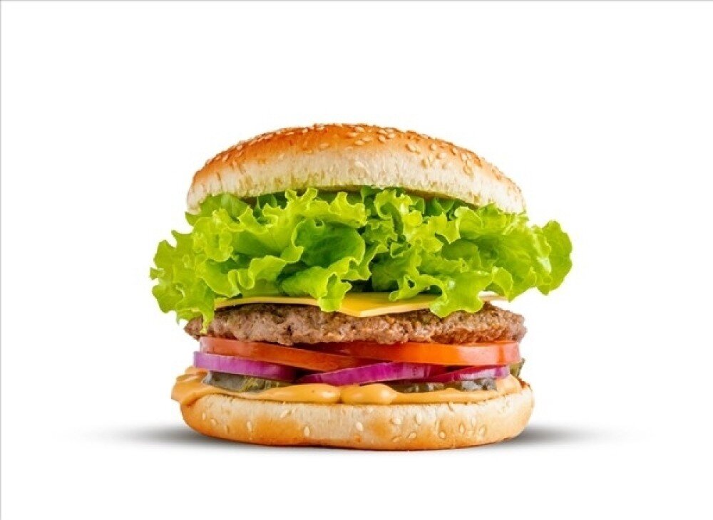 150 g hovězího masa, tavený sýr Cheddar, bulka dle výběru, nakládaná okurka, cibule, rajče, salát, Master omáčka