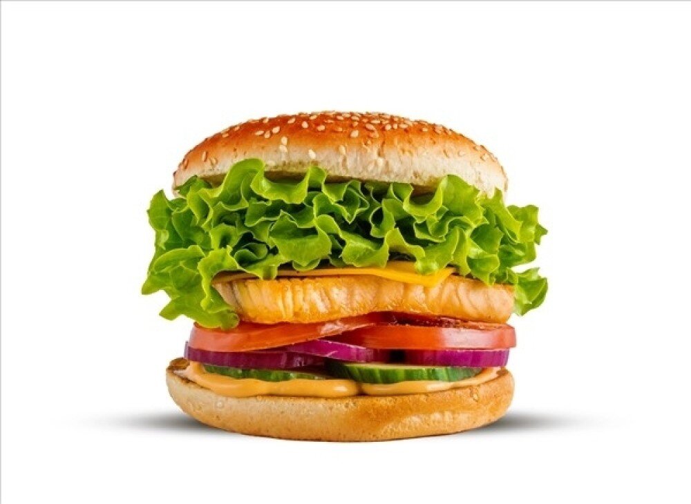 100g grilovaného filé z lososa, tavený sýr Cheddar, bulka dle výběru, okurka, rajče, cibule, salát, Tatarská omáčka