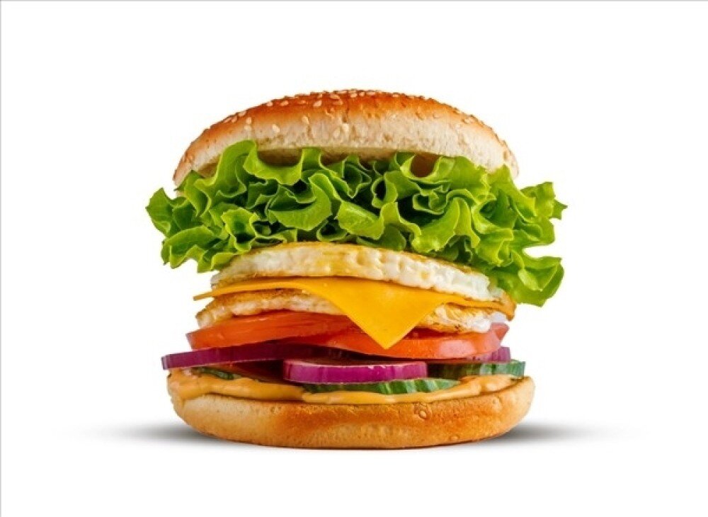 2× smažené vejce, tavený sýr Cheddar, bulka dle výběru, okurka, cibule, rajče, salát, Master omáčka