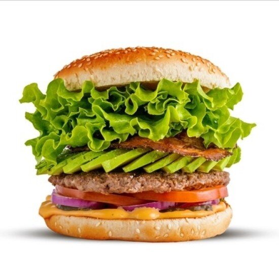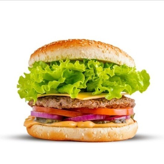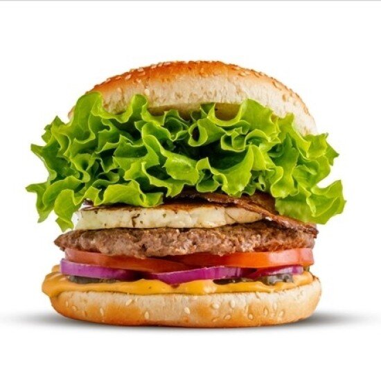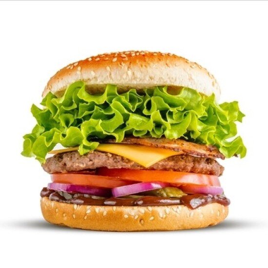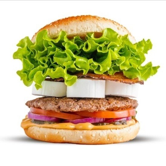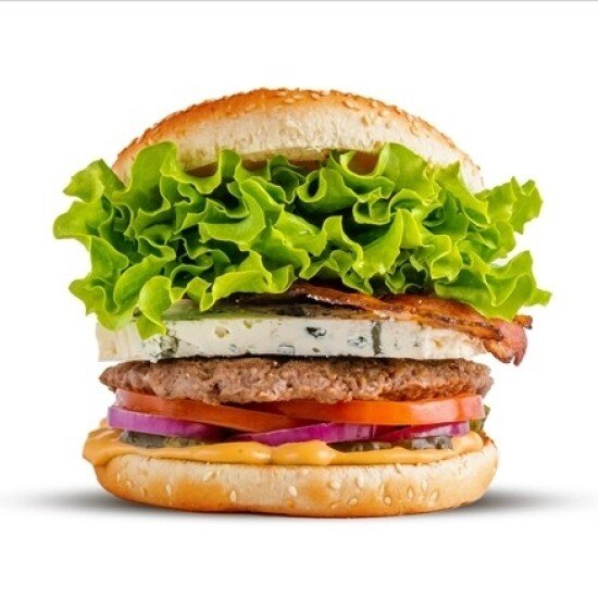150 g hovězího masa, tavený sýr Cheddar, slanina, vejce, bulka dle výběru, nakládaná okurka, cibule, rajče, salát, omáčka
