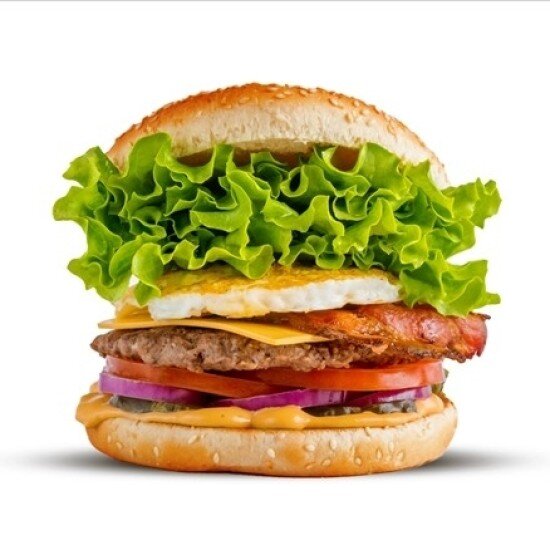 150 g hovězího masa, modrý sýr, slanina, bulka dle výběru, nakládaná okurka, cibule, rajče, salát, omáčka.