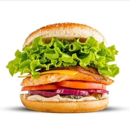 100 g kuřecího steaku, modrý sýr, slanina, bulka dle výběru, nakládaná okurka, cibule, rajče, salát, omáčka.