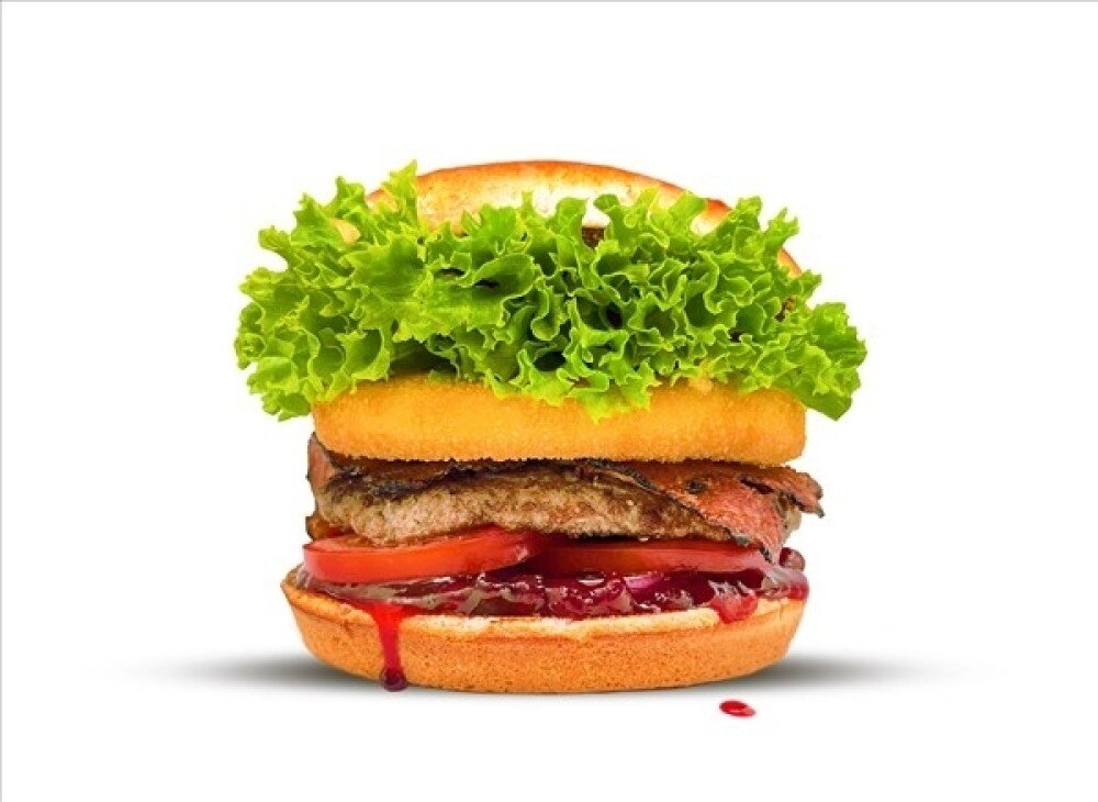 150 g hovězího masa, smažený sýr Gouda, slanina, bulka dle výběru, nakládaná okurka, cibule, rajče, salát, brusinkový džem