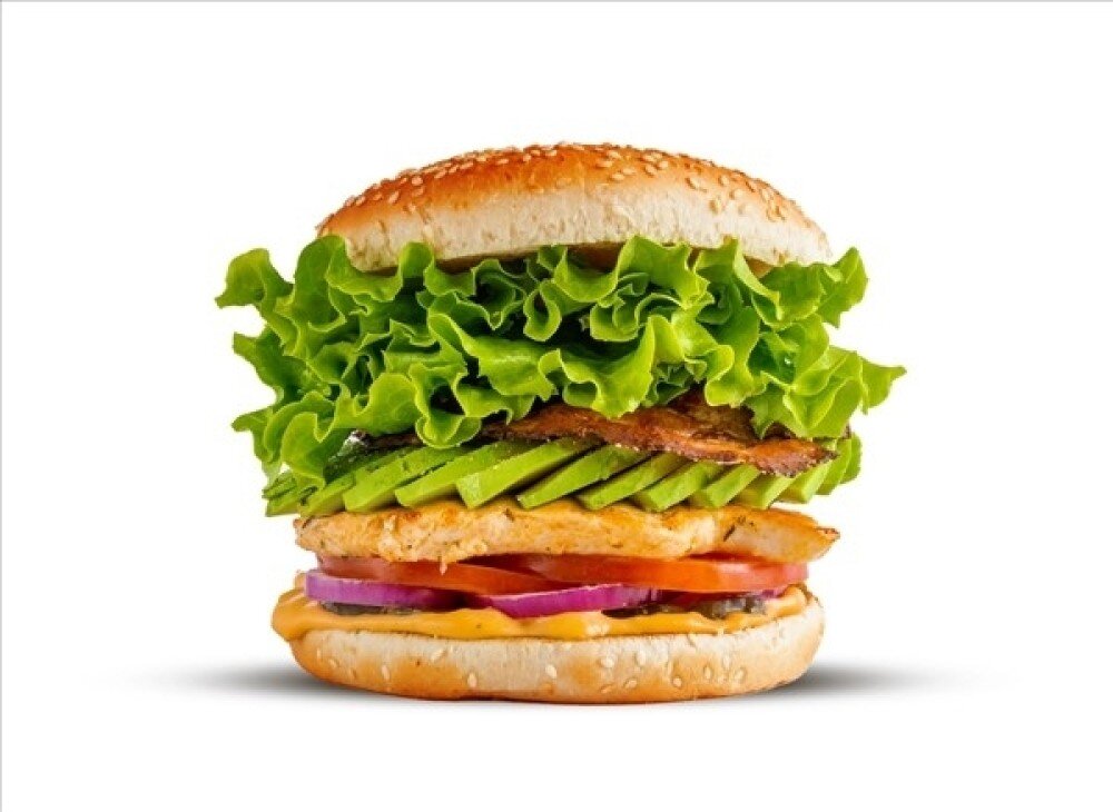 100 g kuřecího steaku, avokádo, slanina, bulka dle výběru, nakládaná okurka, cibule, rajče, salát, Master omáčka