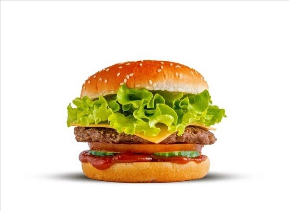 55 g hovězího masa, tavený sýr Cheddar, sezamová mini bulka, okurka, rajče, salát, kečup