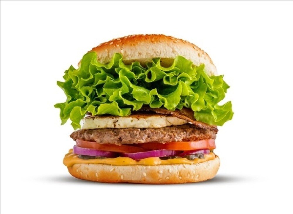 150 g hovězího masa, sýr Halloumi, slanina, bulka dle výběru, nakládaná okurka, cibule, rajče, salát, Master omáčka