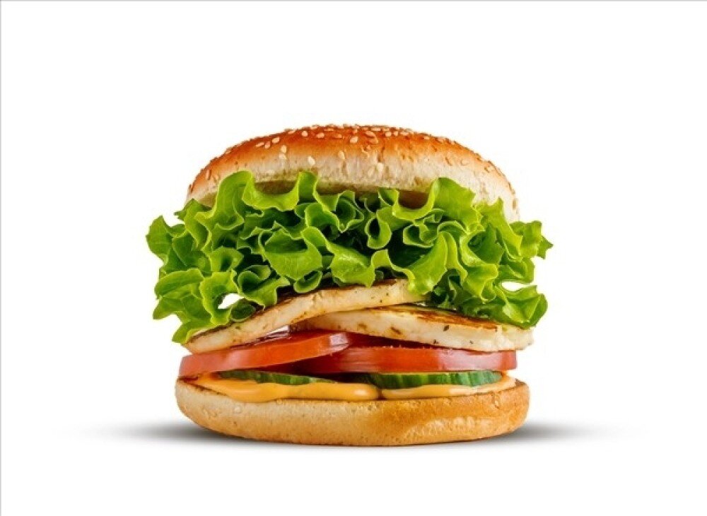Grilovaný sýr Halloumi, bulka dle výběru, okurka, rajče, salát, Master omáčka