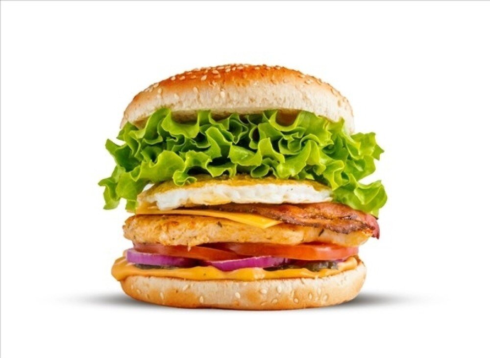 100 g kuřecího steaku, tavený sýr Cheddar, slanina, vejce, bulka dle výběru, nakládaná okurka, cibule, rajče, salát, Master omáčka