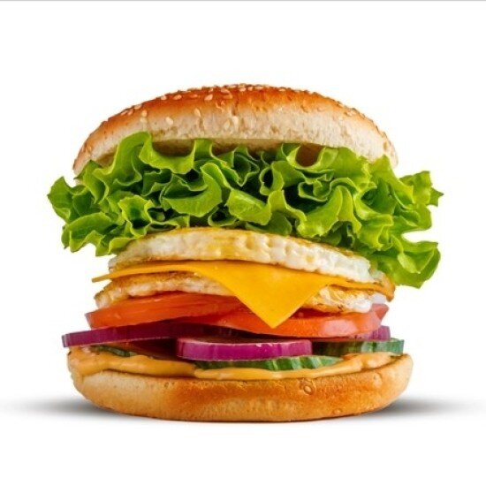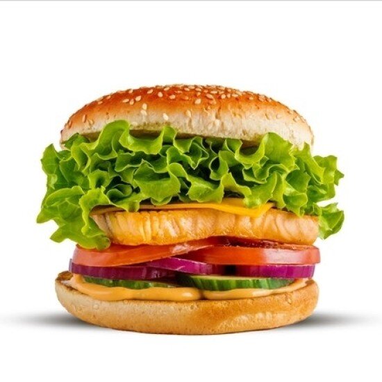 110 g veganský burger z rostlinných proteinů, tavený sýr Cheddar , bulka dle výběru, nakládaná okurka, cibule, rajče, salát, Pepřová omáčka
