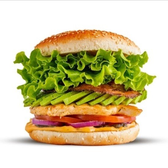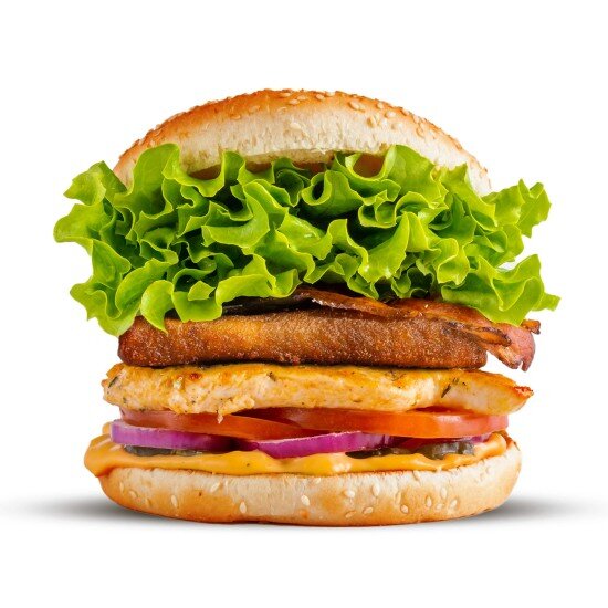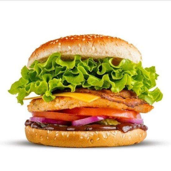 100 g kuřecího steaku, tavený sýr Cheddar, slanina, bulka dle výběru, Jalapeño, cibule, rajče, salát, pálivá omáčka Samuraj